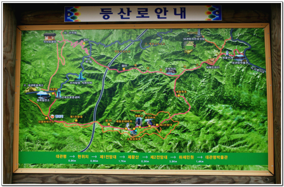 항공지도를 이용한 등산안내판이 백두대간길 대관령~닭목령 구간을 한눈에 정확하게 보여준다.